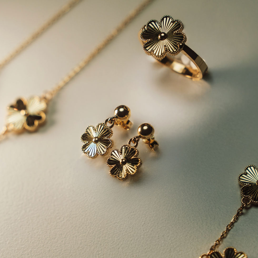 Elegantly crafted, the Clover Bundle Set II offers a sophisticated collection featuring a necklace, bracelet, ring, and earrings adorned with delicate clover motifs. The standout feature of this set is its refined necklace design, which highlights multiple clover charms linked seamlessly for a graceful and modern look. Perfect for adding a timeless yet versatile touch to your jewelry collection, this set transitions beautifully from casual to formal wear.